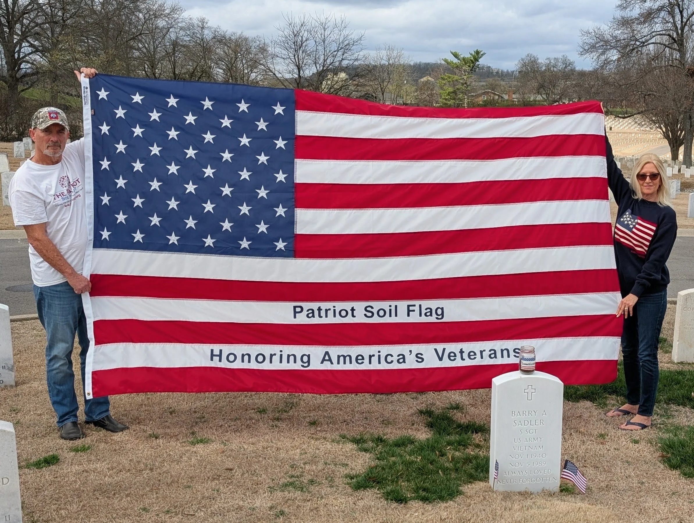 About Us — Mary & Gary RobinsonThe Patriot Soil Flag was brought to life through the unique vision and tireless dedication of Mary and Gary Robinson, founders of the Patriot Soil Project (patriotsoil.org). Both former U.S. military members, they have spent the past decade traveling the country, personally gathering soil from over 100 veterans’ cemeteries across all 50 states, including Arlington National Cemetery.